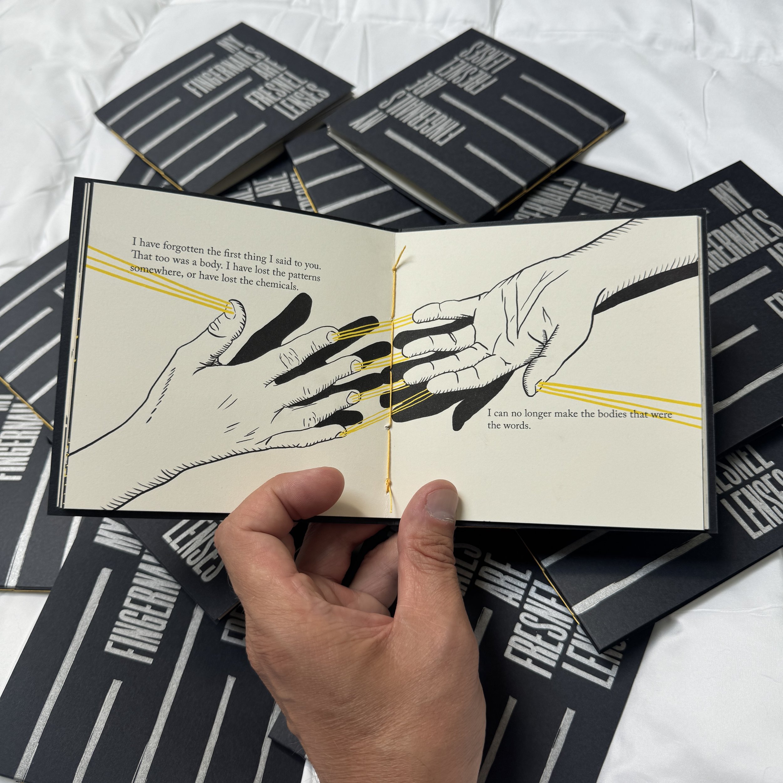 In the summer of 2025 I completed a project in partnership with Chris Fritton at the Artist Residency at Directangle Press in Bethelem, NH. The books are a reboot of Fritton’s poem “My Fingernails Are Fresnel Lenses” and features 10 two-color illustrations. The final products are letterpress- and linocut-printed, and the body of the book is risograph-printed.